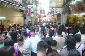 圖:澳門大三巴手信街?jǐn)D滿游客。(圖片來(lái)源:澳門日?qǐng)?bào))