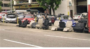 將座椅地氈擺車頂、路邊,成修車行一帶新景觀。(圖片來源:澳門日報)