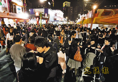 香港工展會(huì)會(huì)場(chǎng)內(nèi)人頭涌涌,在平安夜中,更愈夜愈精彩。面食、醬油及日常用品銷(xiāo)售仍然暢旺,而售賣(mài)應(yīng)節(jié)物品的攤位更受入場(chǎng)人士歡迎。