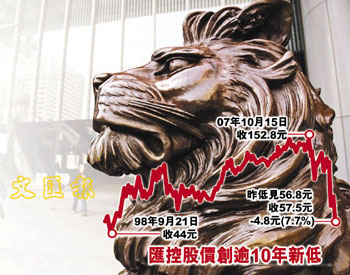 匯控單日急挫7.7%,圖表顯示其有跡象下試50元以下水平,但白韌認(rèn)為,匯控跌穿60元已經(jīng)接近底部,雖然匯控表示沒(méi)有財(cái)政壓力,但卻受制于市場(chǎng),若早些宣布集資,反而可掃除其不明朗因素。7天以來(lái)匯控股價(jià)已下跌23%,市值因而蒸發(fā)2062億元。