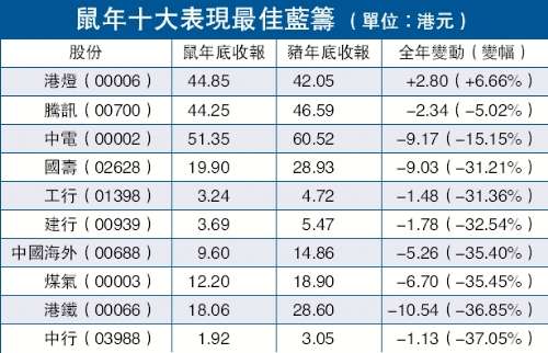 大市重挫,恒指成分股亦不見(jiàn)得好過(guò)。在42只藍(lán)籌股中,只得港燈(00006)一只錄得升幅,全年計(jì)漲2.8元或6.66%;緊隨其后已為跌5.02%的鼠年藍(lán)籌新貴騰訊(00700),其余成分股大部分跌幅逾五成以上,富士康(02038)更跌近八成。