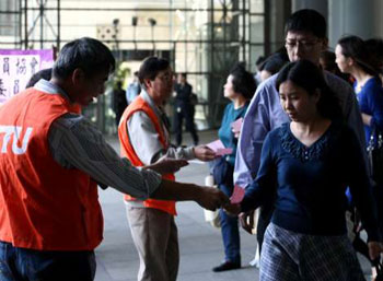 10名工聯(lián)會和銀行業(yè)雇員協(xié)會代表9日在午膳時間,在匯豐總行向匯豐員工派發(fā)傳單,呼吁員工如被裁員和受到不公平的對待,可致電向協(xié)會求助。
