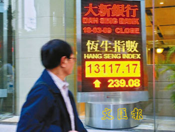中新網(wǎng)3月19日電 據(jù)香港《文匯報(bào)》報(bào)道,受到外圍金融股造好,港股18日隨美股高開(kāi)175點(diǎn),匯控連升7天,重上42元,帶動(dòng)恒指重上13000點(diǎn),大市全日升239點(diǎn)或1.86%,收?qǐng)?bào)13117點(diǎn)。國(guó)企指數(shù)升124點(diǎn),報(bào)7632點(diǎn)。不過(guò),大市成交縮減至375億元;期指收?qǐng)?bào)13113點(diǎn),升289點(diǎn),比現(xiàn)貨低水4點(diǎn),成交65441張。