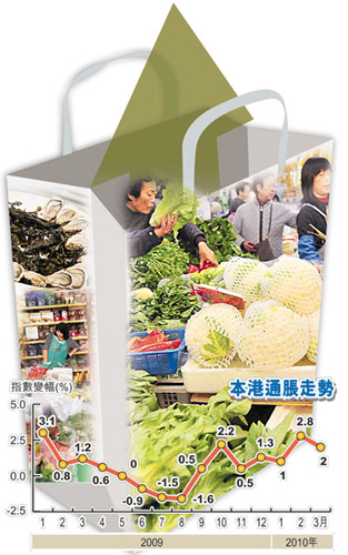 統(tǒng)計處昨日公布,3月份綜合消費物價指數(shù)按年上升2%,較2月份的2.8%為低,但由于2月份為農(nóng)歷新年消費旺季,因此若將今年首兩個月的物價指數(shù)合并計算,按年升幅為1.9%,故3月份物價仍有0.1個百分點的升幅。數(shù)字亦顯示,今年首季綜合消費物價指數(shù)按年上升1.9%。