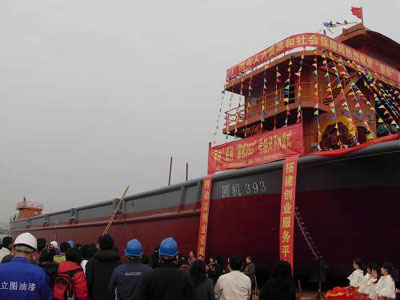 圃機393號船身長80米,排水量約齊千噸,載重可達5000噸,號稱珠江三角洲第一艘甲板工程船。該船將用于港珠澳大橋工程運輸,包括搬運石頭、攪拌機等,目前已簽約運輸石30萬立方米,每天運輸3500立方米,為港珠澳大橋建設打基礎。