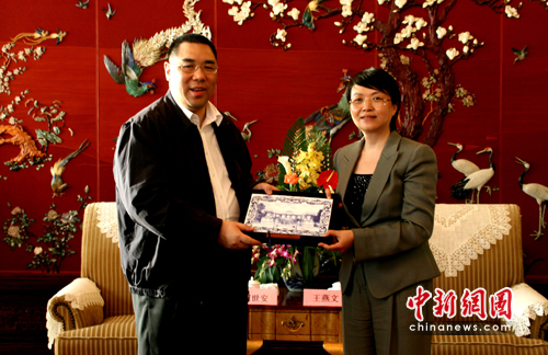 下午5時許,揚州市委書記王燕文在迎賓館與澳門特首崔世安親切交談并互贈禮品。
