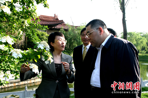 會見前,揚州市委書記王燕文向澳門特首崔世安特別介紹在他下榻迎賓館門前的揚州市花—瓊花,瓊花有著“維揚一枝花、四海無同類”的美譽,崔世安在此欣然留影紀念。