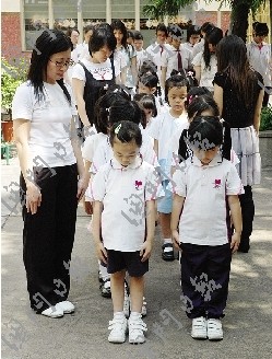 12日下午2時28分,圣心女子中學(xué)校長蘇映璇引領(lǐng)全體師生默哀一分鐘,悼念去年汶川大地震死去的同胞,該校各級學(xué)生代表也在操場進(jìn)行獻(xiàn)花儀式。