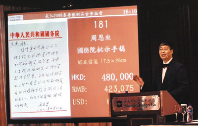 中新網(wǎng)5月25日電 據(jù)香港《文匯報》報道,長江2009春季藝術(shù)品、古董拍賣會24日首次在香港展開,近400件珍品成功售出,總成交額高達(dá)1.3億元。拍賣品中包括珍貴的已故國務(wù)院總理周恩來親手批核的國務(wù)院批示手稿,24日以48萬元高價成交。