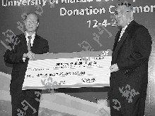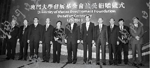 澳門社會(huì)知名人士何鴻燊、曹其真,以及呂志和基金有限公司、澳門霍英東基金會(huì)分別向澳大發(fā)展基金會(huì)捐款3000萬澳門元,款項(xiàng)將作為基金會(huì)的永久性基金,由基金會(huì)管理,并僅作支持澳大發(fā)展之用。除前立法會(huì)主席曹其真親自捐贈(zèng)外,澳門博彩股份有限公司董事蘇樹輝代表何鴻燊,呂志和之子呂耀東代表呂志和基金有限公司,澳門霍英東基金會(huì)主席霍震寰代表該基金會(huì)向澳大捐贈(zèng)有關(guān)款項(xiàng)。