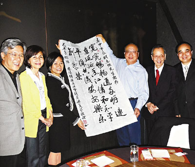 會上,梁美芬送了一幅字畫給胡志強(qiáng)作見面禮,上面寫有她創(chuàng)作的一首賦:“寬寬暢暢通海峽、連連延延香江情、和和平平謀共識、安安樂樂創(chuàng)繁榮”。胡志強(qiáng)也禮尚往來,充分發(fā)揮其幽默本色,說“從政就是要所有人快樂”。