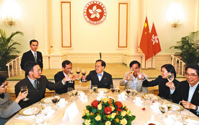 曾蔭權(quán)5日在禮賓府筵開5席,來自各黨各派的約40名議員依時(shí)赴會(huì),財(cái)政司司長(zhǎng)曾俊華、律政司司長(zhǎng)黃仁龍及大部分局長(zhǎng)和副局長(zhǎng)也同為座上客。據(jù)引述,曾蔭權(quán)在午宴上致辭時(shí)向議員們笑說,議事之外都有人情,火花之外都有風(fēng)花雪月,5日的宴請(qǐng)是希望大家除了公事之外,也有多些溝通和交流。