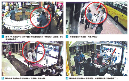 陳佑銘女兒陳怡透露,事發(fā)當日(22日)其父被鄭姓導(dǎo)游要求在紅磡JW Jewellery Outlet Limited珠寶店逗留至少2小時。由于珠寶店大門關(guān)上、樓底矮、人多又沒座位,他感到局促,在店內(nèi)逗留半小時后到店外透氣,20分鐘后鄭導(dǎo)游要求他回到店內(nèi)。陳怡說:“當時父親表明自己身體不適,又有心臟病,導(dǎo)游反而搶白父親是以病威脅,令老人家非常氣憤!标愑鱼懹诳诮瞧陂g病發(fā)暈倒,送院后證實死亡。