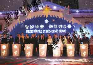 亮燈儀式昨日下午六時(shí)舉行。隨著主禮嘉賓按鈕,全澳的節(jié)日燈飾實(shí)時(shí)放亮,璀璨奪目。文化中心兒童合唱團(tuán)獻(xiàn)唱圣誕歌曲及圣詩(shī),喜悅的樂章、清脆的歌聲遍布廣場(chǎng);圣誕老人在現(xiàn)場(chǎng)向嘉賓及居民派發(fā)糖果,逗得小朋友歡天喜地。