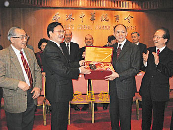 中總霍震寰會(huì)長(zhǎng)以及林廣兆、張成雄、陳幼南、林銘森副會(huì)長(zhǎng)及多位常董、會(huì)董與來賓座談,并設(shè)晚宴歡迎李春明副省長(zhǎng)一行;粽疱緯(huì)長(zhǎng)與林廣兆副會(huì)長(zhǎng)均表示,中博會(huì)是信息交流的重要平臺(tái),是世界了解中部地區(qū)發(fā)展的窗口,香港工商界都十分重視。中總長(zhǎng)期以來與香港工商界以及世界華商保持緊密聯(lián)系,可以協(xié)助湖北省政府發(fā)布中博會(huì)信息。