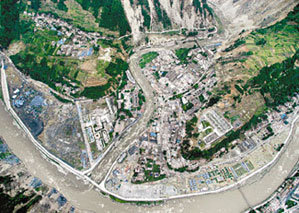 傍晚5時(shí)30分,飛機(jī)飛抵汶川縣映秀鎮(zhèn)上空,記者在機(jī)組人員的幫助下,打開(kāi)機(jī)艙門(mén),向外張望,發(fā)現(xiàn)整個(gè)鎮(zhèn)子已經(jīng)變?yōu)橐黄瑥U墟,只有少數(shù)的工廠外墻還在堅(jiān)強(qiáng)地佇立著!斑@里是地震的中心地帶,相反汶川縣城卻沒(méi)有那么嚴(yán)重的,只是道路不通影響救援而已!