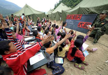 聚源中學的學生在復課日里起誓,說要安心學習,回報社會。北川中學高三學生劉倩在日記中寫道:“我們有義務與責任盡自己所能去重建我們的家園。請重新樹立起信心吧,中華民族從來都是打不垮的,中國人民從來都是不屈不撓的,我們已經(jīng)與死亡握過了手,我們還有什么可畏懼的呢……讓我們互牽友愛的手,用愛去敲響我們的未來……請相信災難后的我們會是永遠的勝利者!庇纱,記者看見,充滿希望的未來正在讀書聲中醞釀誕生。