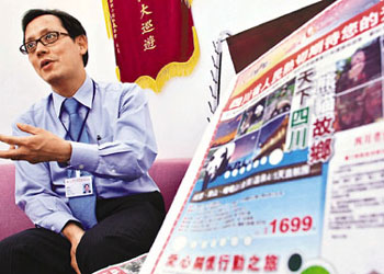 中旅社業(yè)務部副總經(jīng)理吳熹安表示,四川省旅游局宣布部分旅游景點恢復接待游客,故集團實時推出低至7折、團費由1699元起的四川4天優(yōu)惠團,另推出團費2799元的5天愛心關(guān)懷團,行程除了傳統(tǒng)的樂山、峨眉山外,亦安排團員參觀地震災區(qū)民眾暫住的“溫馨家園”,讓團員向四川人民送暖。
