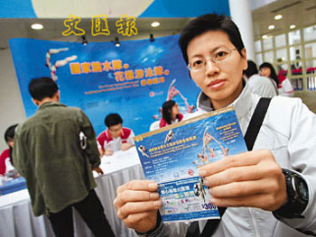 經(jīng)常前來(lái)九龍公園游泳池游水的董先生開(kāi)售前半小時(shí)前來(lái)購(gòu)買(mǎi)7張150元的門(mén)票,以欣賞在北京奧運(yùn)會(huì)進(jìn)步最大的花泳隊(duì)表演。