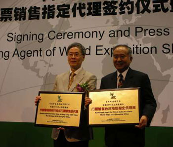 中新網(wǎng)3月3日電 據(jù)香港《大公報(bào)》報(bào)道,“中國(guó)2010年上海世博會(huì)門票銷售制定代理簽約儀式暨媒體見面會(huì)”2日下午在上海世博局舉行,此次簽約的13家銷售代理商,境內(nèi)代理商4家,境外代理商9家。香港中國(guó)旅行社成為首批簽約的上海世博會(huì)門票境外指定代理商之一,香港中旅總經(jīng)理周來衛(wèi)接受了上海世博局授牌。