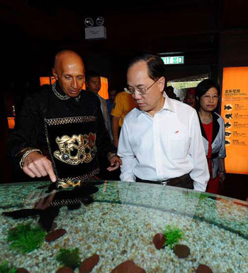 曾蔭權還到了“金魚寶典”一睹全球最大的黑獅頭金魚,他在金魚愿望樹上寫上愿望,意指海洋公園全球第一。