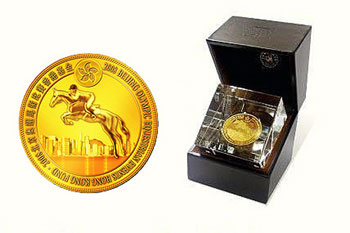紀(jì)念章以925純銀鍍金鑄造,香港著名平面設(shè)計(jì)師陳幼堅(jiān),以馬術(shù)運(yùn)動(dòng)員跨躍維港為主題,造工精細(xì),維港旁的建筑物清晰可辨;背面則以區(qū)徽及2008字樣作點(diǎn)綴。每枚紀(jì)念章均附有個(gè)別編號(hào)的鑒證書(shū)、水晶座及木盒,盒面用馬毛制成。