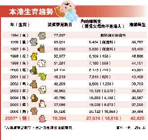 據香港明報報道,2007年醫(yī)管局共錄得39,182名新生嬰數字,醫(yī)管局總行政經理鄭信恩說,雖然傳統(tǒng)上生仔旺季一向在9月至11月,但今年首個半月公立醫(yī)院生產個案,已明顯較去年同期上升,“去年經濟好,市民積極想生育多點,估計今年生育也會多,新生嬰應會超過去年!