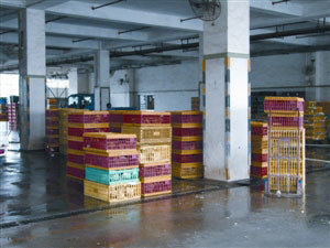 圖:工人清洗批發(fā)市場(chǎng)內(nèi)設(shè)施及使用過(guò)的膠籠。(圖片來(lái)源:澳門(mén)日?qǐng)?bào))