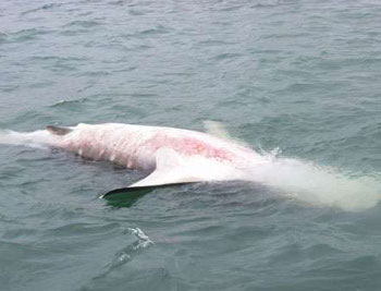 豈料事隔一日,至8日上午9時(shí)許,有釣魚(yú)發(fā)燒友租艇由香港仔往南丫島垂釣,開(kāi)船15分鐘后即在鴨利洲以東海面發(fā)現(xiàn)一條大魚(yú)浮尸,而當(dāng)時(shí)已有一艘水警輪在場(chǎng),他相信該條大魚(yú)尸體就是日前放生的鯨鯊,事后更將拍攝的相片上載到互聯(lián)網(wǎng),引起網(wǎng)友熱烈討論。