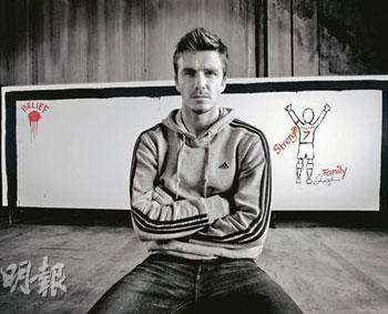 貝克漢姆在某廣告中即席揮毫,畫了《圓的世界》。(圖片來源:明報(bào))