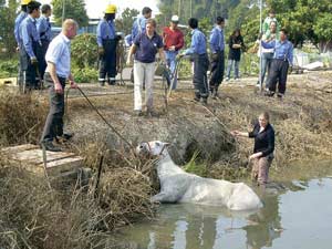 消防接報(bào)趕至,欲合10多人之力拉馬上水,但白馬大驚掙扎不肯上岸,馬場職員唯有不斷喂紅蘿卜安慰馬兒情緒。