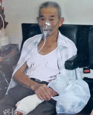 年邁的陳父左手腕受傷,在場(chǎng)接受包扎后送院治理。(圖片來源:明報(bào))
