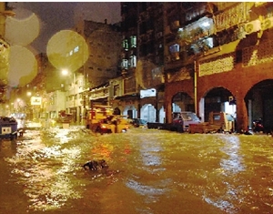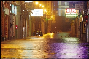 澳門沿岸海面23日現(xiàn)驚濤駭浪,漁船紛回港暫避。內(nèi)港、新馬路一帶晚上10時后出現(xiàn)海水倒灌,加上傾盆暴雨,路面最高水深至小腿。新馬路內(nèi)街出現(xiàn)水浸,電箱冒煙,大廈停電。福隆新街一帶水浸嚴重,高達1米,浸過變電站,電力公司被逼關(guān)閉電源,一帶商鋪全部被淹,料損失嚴重。