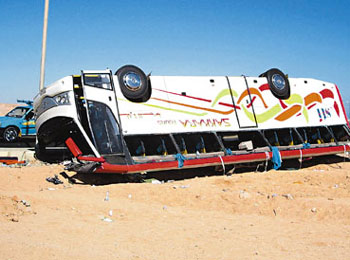 中新網(wǎng)9月28日電 據(jù)香港《文匯報》報道,香港旅行團2006年新春期間在埃及遇上嚴重車禍,旅游巴在駛經(jīng)紅海度假城市洪加達附近時,疑因司機超速駕駛,在急彎失控翻車,造成14死30傷的慘劇。