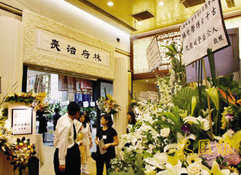 林世榮的靈堂,以金黃的慧蘭和白色百合花布置,遺孀與3名子女致送給亡夫亡父的心形花牌,花牌由黃色玫瑰造成,放于靈前當眼處。而靈堂的橫匾,寫著“往生凈土”,左右兩側(cè)掛上大挽聯(lián)“世人贊頌一代商才,恒豐盛業(yè)傳永世”,“榮澤綿延千秋遺愛,至尊美譽葆長榮”。
