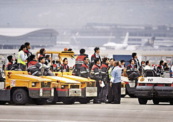 上月底,因?yàn)橘Y方停發(fā)“工作表現(xiàn)獎(jiǎng)”,機(jī)場(chǎng)地勤服務(wù)公司員工進(jìn)行歷時(shí)3小時(shí)的“警示式罷工”,半癱瘓機(jī)場(chǎng)6小時(shí);在香港勞工處斡旋下,勞資雙方5日進(jìn)行談判。
