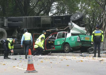 消防員接報(bào)趕至現(xiàn)場,發(fā)現(xiàn)被壓扁的的士車廂內(nèi)躺著6名男子,但已全部氣絕身亡,部分人更被壓至面貌變形,頭顱爆裂。警方事后驗(yàn)出被告酒精含量是153微克,超標(biāo)6倍半。