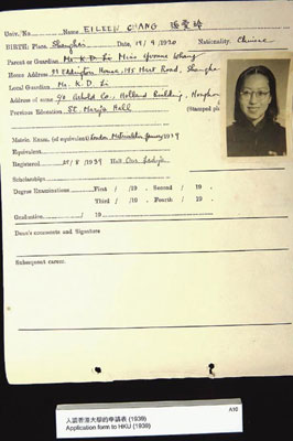 這次展覽的多數(shù)展品,是由宋以朗先生提供,如有張愛玲親筆簽名的《傾城之戀》等著作以及《談色.戒》初稿。“初稿”表露張愛玲回應(yīng)刊于當(dāng)年臺灣《中國時報》內(nèi)署名“域外人”對《色.戒》的批評。是次展覧,香港大學(xué)則展示了張愛玲的入學(xué)證明,上面附有她戴著圓厚眼鏡的學(xué)生照。但上面的出生日期為九月十九日,與后來她申請美國綠卡時所填的九月三十日不同。