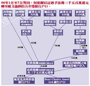在最初階段,何明輝涉向歐文龍行賄時,一般只是透過新明輝的二判商、公司職員或何明輝妹妹何婉芬,經(jīng)一兩層清洗后,賄款已去到由歐文龍所操控的香港銀行賬戶內(nèi)。自○五年九至十一月期間,何明輝涉向歐文龍交付一筆三千一百多萬港元款項(xiàng)時,過程開始轉(zhuǎn)趨迂回復(fù)雜。何明輝先將賄款轉(zhuǎn)入旗下二判商后,再由新明輝經(jīng)理?xiàng)钊A鋼所開設(shè)鑫華公司收集賄款,由楊華鋼本人賬戶多次匯款后,方去到歐文龍操控的Ecoline Property Limited香港銀行賬戶。