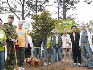 嘉賓與澳門學(xué)生首先卷袖揮鍬,栽下多株小樹,平整泥土,并親自為樹苗澆水。200多名官兵隨后與居民一起刨坑鏟土、提桶澆水,顯得非常高興和投入,經(jīng)過一個(gè)多小時(shí),逾千棵的小樹實(shí)時(shí)為空曠的山頭帶來無限的生機(jī),為山林再添一片新綠。