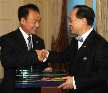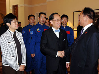 中新網(wǎng)12月8日電 據(jù)香港特區(qū)政府網(wǎng)站消息,“神舟七號(hào)”載人航天飛行代表團(tuán)8日結(jié)束4天訪港行程,離港前出席了香港特首曾蔭權(quán)在禮賓府為他們舉行的歡送會(huì)。