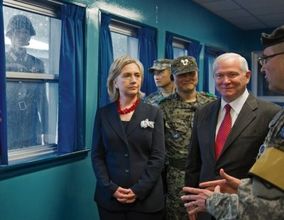 21日,韓美兩國(guó)外長(zhǎng)和防長(zhǎng)對(duì)板門點(diǎn)的訪問受到了不亞于“2+2”會(huì)談的高度關(guān)注。希拉里和蓋茨也受到朝鮮士兵的“怒目相迎”。