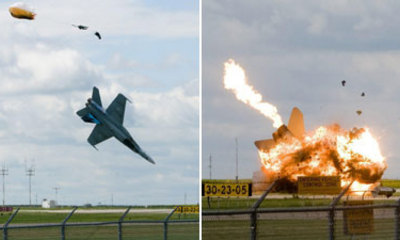 據(jù)悉,這架戰(zhàn)機(jī)是在做超低空飛行動作時(shí)墜毀的。目擊者說,飛行員是在飛機(jī)離地面30米處被彈出機(jī)艙,拉開降落傘成功逃生。