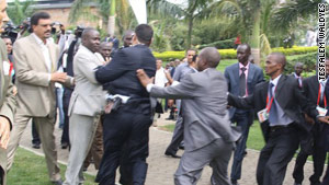 峰會(huì)第一天,利比亞總統(tǒng)衛(wèi)隊(duì)即與烏干達(dá)安全人員發(fā)生了拳腳沖突。根據(jù)CNN記者薩曼森納塔爾的描述,當(dāng)時(shí)正要舉行峰會(huì)開(kāi)幕式。按照規(guī)定,只有國(guó)家首腦被允許進(jìn)入會(huì)場(chǎng)。利比亞總統(tǒng)衛(wèi)隊(duì)試圖護(hù)送卡扎菲通過(guò)入口,遂與烏干達(dá)安全人員發(fā)生爭(zhēng)論,隨后升級(jí)為肢體沖突,但是雙方?jīng)]有動(dòng)槍。