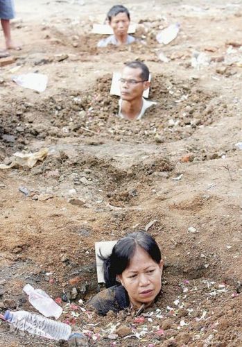 中新網(wǎng)8月3日電 據(jù)《明報(bào)》報(bào)道,印度尼西亞雅加達(dá)一個(gè)貧民窟的居民,2日將自己埋入泥土,僅伸出頭部,以抗議政府強(qiáng)行拆遷。