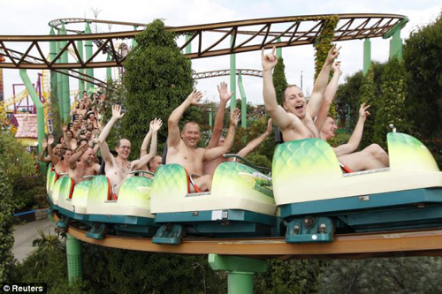 中新網(wǎng)8月9日電 據(jù)英國(guó)媒體報(bào)道,當(dāng)?shù)貢r(shí)間8月8日,102名英國(guó)男女齊聚艾塞克斯郡冒險(xiǎn)島游樂(lè)園,將衣服全部脫掉,體驗(yàn)裸體乘坐“綠色尖叫”過(guò)山車的刺激感覺(jué)。這102人也創(chuàng)造了一項(xiàng)新的世界紀(jì)錄。