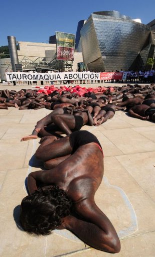 周末的抗議活動(dòng)由國(guó)際動(dòng)物保護(hù)團(tuán)體策劃,抗議者在身上涂上紅色顏料,象征鮮血,倒臥地上排成牛只的圖形,并大聲疾呼,效法加泰羅尼亞地區(qū)禁止斗牛。