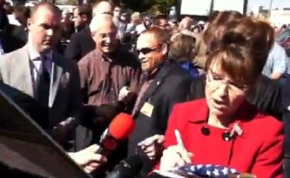 與此同時(shí),奧巴馬中期選舉的競(jìng)爭(zhēng)對(duì)手,共和黨人莎拉·佩林卻做了一件令美國(guó)人詬病的事。她沒有在“ipad”上簽名,而是選擇了在星條旗上簽上自己的大名。