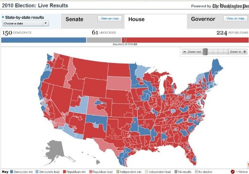 總統(tǒng)奧巴馬所在的民主黨在眾議院已開出的席位中獲得了150個席位;而其最大對手——共和黨在已開出的席位中,已占據(jù)224個席位。還有61個議席等待開出。
