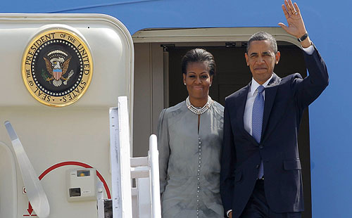報道稱,奧巴馬乘坐的“空軍一號”專機(jī)于當(dāng)?shù)貢r間中午12時50分左右降落孟買國際機(jī)場。美國總統(tǒng)和第一夫人走出機(jī)艙向迎接的美印兩國政要招手致意。